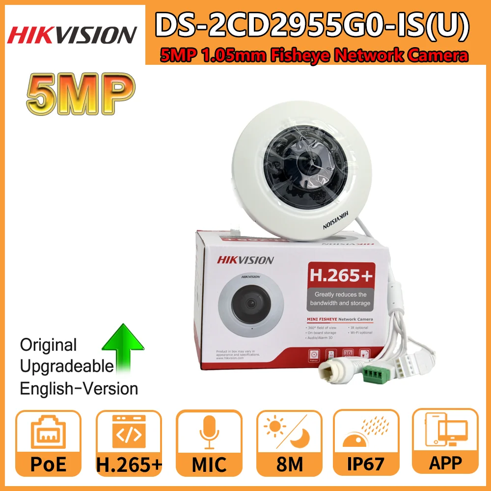 Hikvision 5MP Fisheye IP Camera DS-2CD2955G0-ISU Support 2-Way Audio 180° Fisheye View Surveillance Built-In Mic SD Card Slot