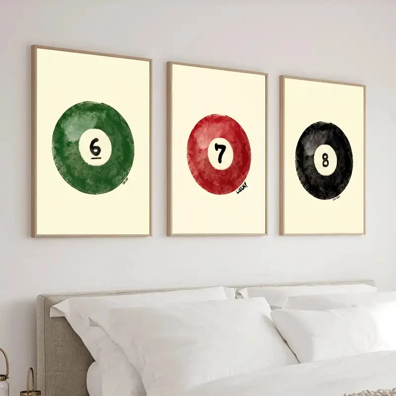3pcs/Set Retro Billiards Hand-painted Wall Art Canvas Poster Fashionable 6 7 8-ball Printed Materials Game Room Home Decoration