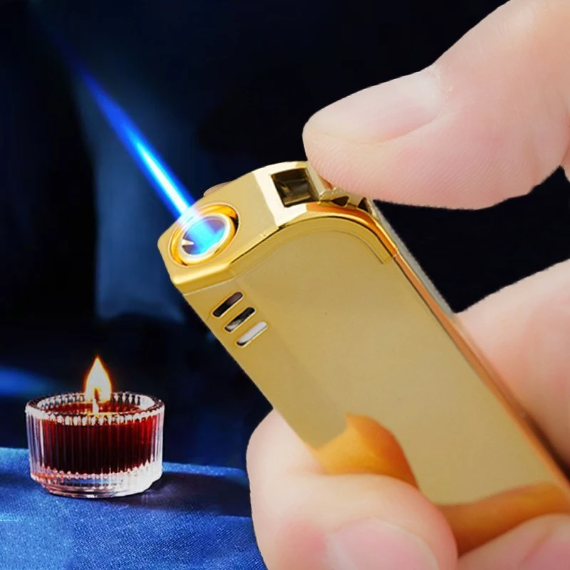 Metal Inflatable Push-Butane Windproof Lighter Hot Luxury Gold Blue Flame Cigarette Lighter Outdoor Camping Tool Survival Men