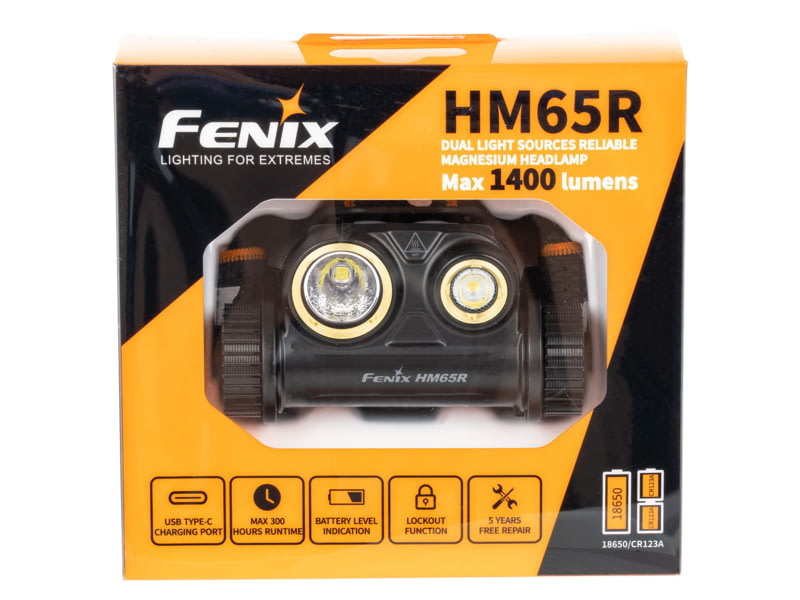 Fenix FX-HM65R CREE LED Headlamp 2x CR123A Black w/Orange Accents FX-HM65R. The headlamp is constructed from ultra lightweight magnesium material. With two Cree LED's the HM65R can reach 1400 Lumens by activating its dual spotlight and floodlight...  Read more
