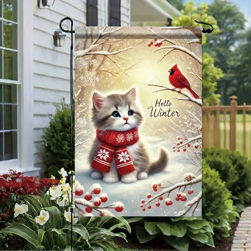 Hello Winter" Cats & Cardinals Welcome Garden Flag 12x18" Linen Double-Sided Garden Flag Outdoor Decor for Christmas and Yard