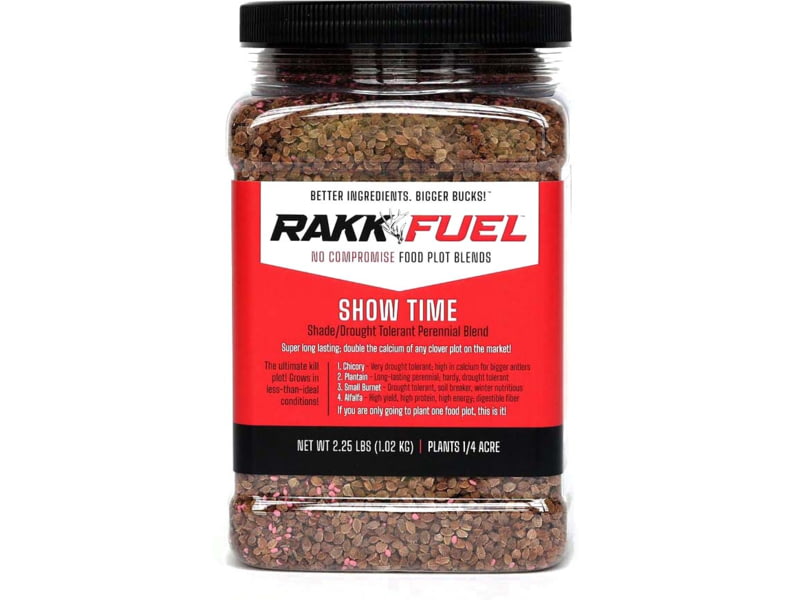 RaKK Fuel Showtime 1/4 Acre Shade/Drought Tolerant Perennial Blend Small 7534. If you are only going to plant one food plot this is it. Unique blend that thrives where others won't. Specifications for RaKK Fuel Showtime 1/4 Acre Shade/Drought...  Read more