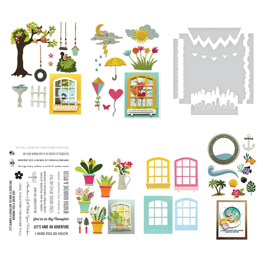 Metal Cutting Dies Window Fence Frame Potted Plant Tree Sun Moon Cloud Die for DIY Scrapbooking Album Decorative Paper Card Craf