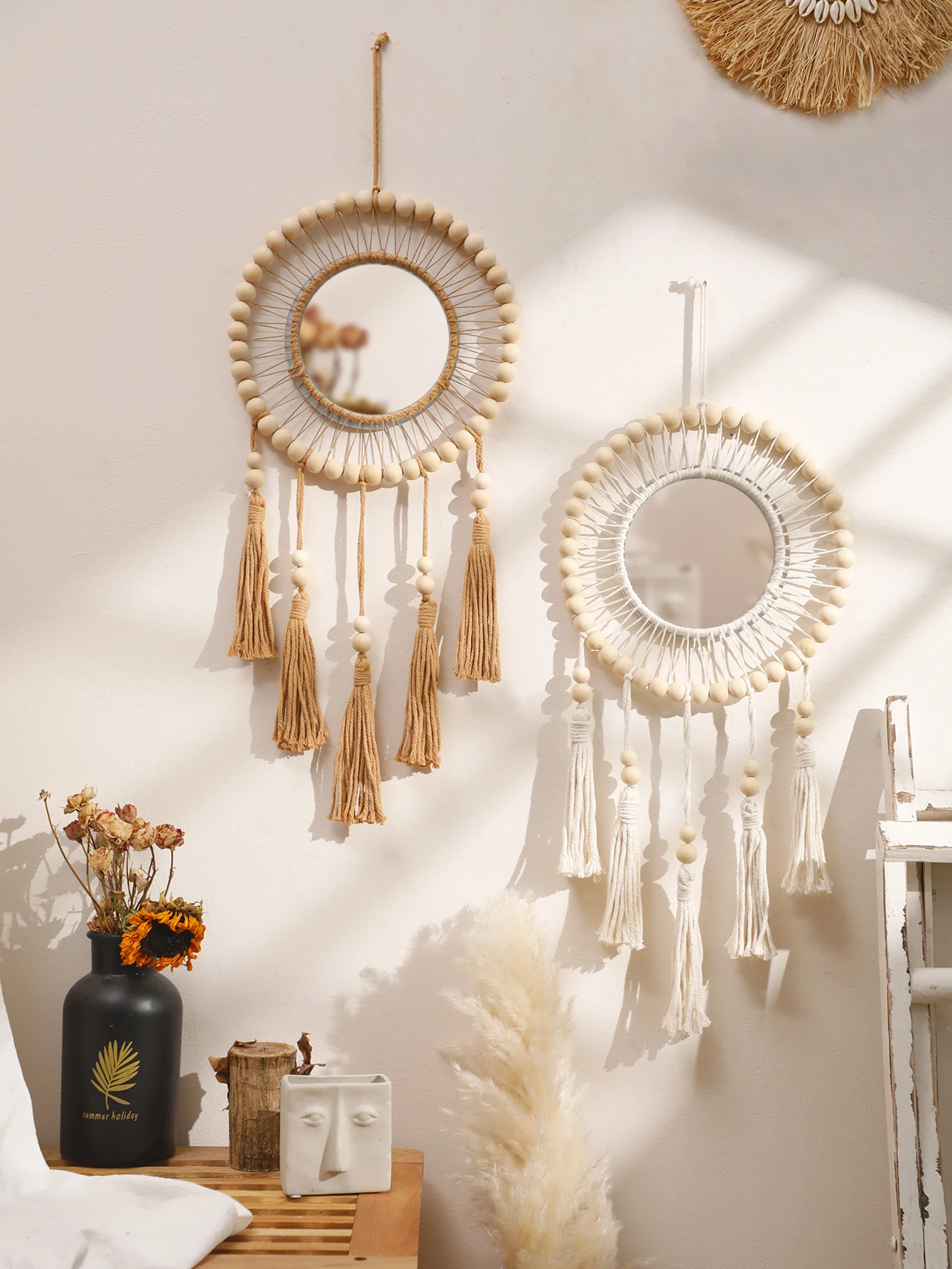 Hand Woven Wooden Beads Decorative Mirrors Wall Hanging Boho Condo Wall Decor Nordic Bedroom Living Room Hallway Home Decoration