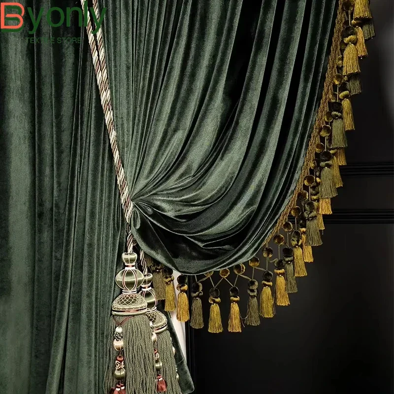 Luxury Retro Dark Green Velvet Tassels Thickened Blackout Curtains for Living Room Bedroom French Window Villa Customization