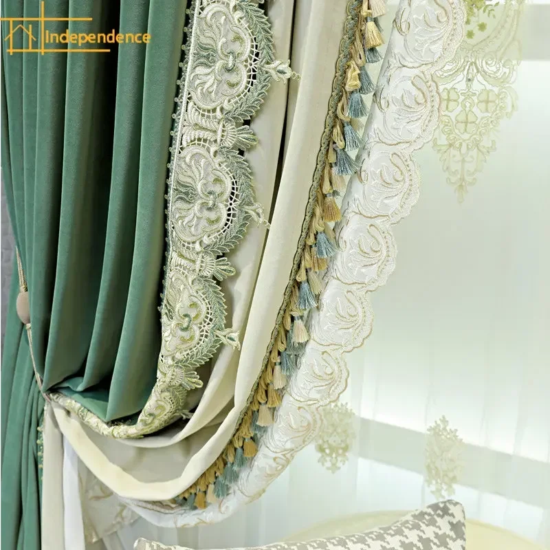 High end light luxury lace splicing blackout green velvet curtains Curtains for Living dining room bedroom
