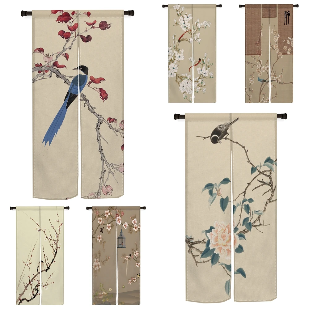Chinese Style Door Curtain Tradition Ink Painting Bird Flower Magpie Peony Linen Curtain Bedroom Kitchen Home interior Curtains
