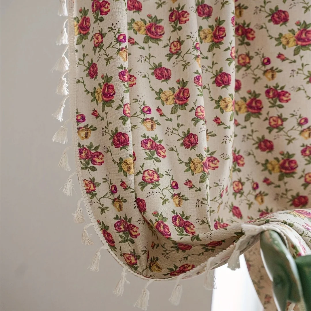 One piece of Bohemian cotton, linen, flowers, semi shading, American pole pocket, farmhouse, beige tassel curtain