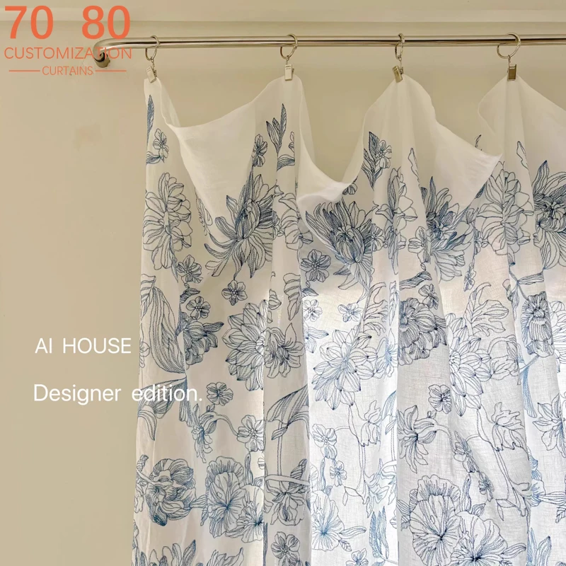 100% Pure Linen Embroidery Jacquard Middle Ancient High Grade Blue Flower Curtains for Window Screen Living Room French Window