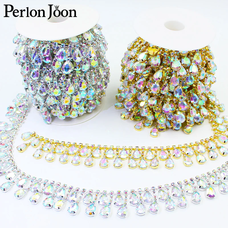 Gold Silver AB Color Rhinestone Trim Acrylic Crystal Water Drop Pendant Beard Chain Curtain Skirt Trim Decorative ML148  Read more