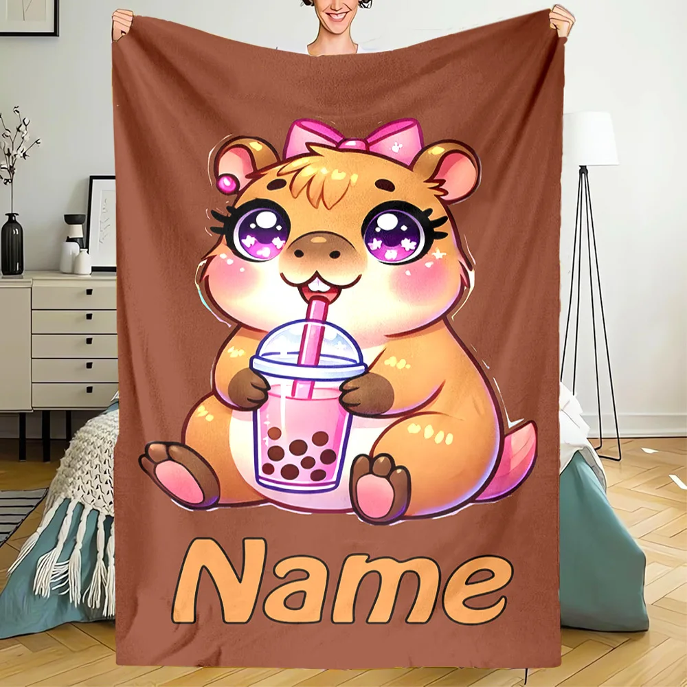 Personalized customized text capybara and Boba tea design velvet blanket, suitable for all seasons, warm home camping office gift