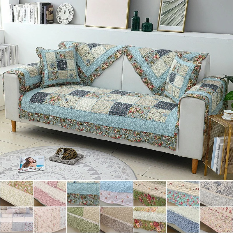 100% Cotton Quilted Sofa Cover Slip Resistant Patchwork Floral Pad Universal Size for Living Room Furniture Decor Anti Slip Mat