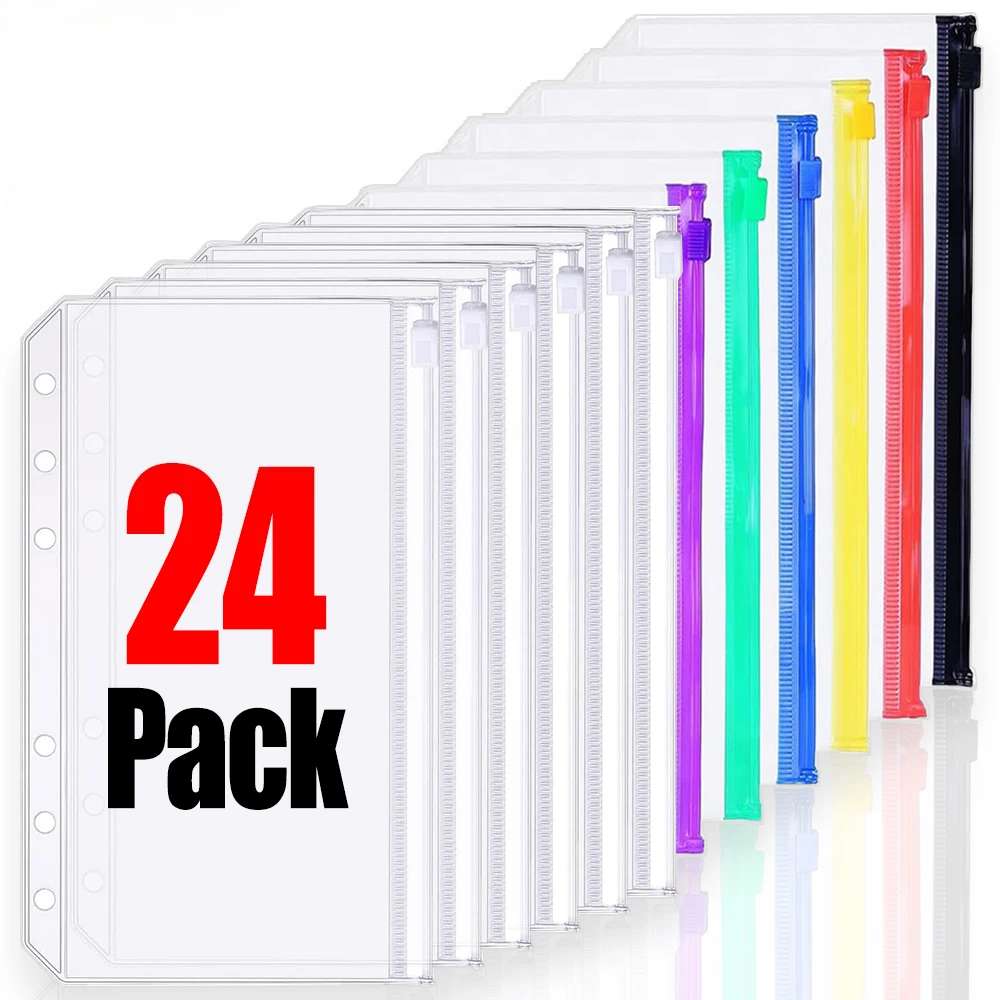 2-24Pcs Clear A6 6-Hole Binder Pockets Waterproof PVC Organizer Cash Budget Envelopes Zipper Binder Pouches for Notebook Planner