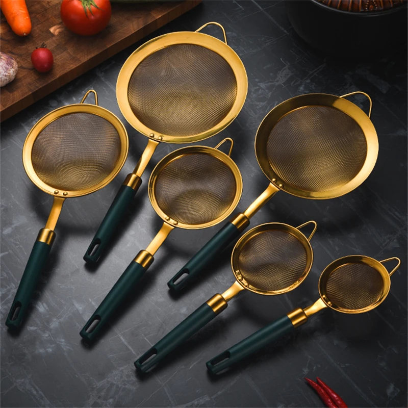 304 Stainless Steel Skimmer Strainer Green Gold Handle Fine Mesh Colander Oil Frying Spoon Noodles Dumpling Sieve Kitchen Tools