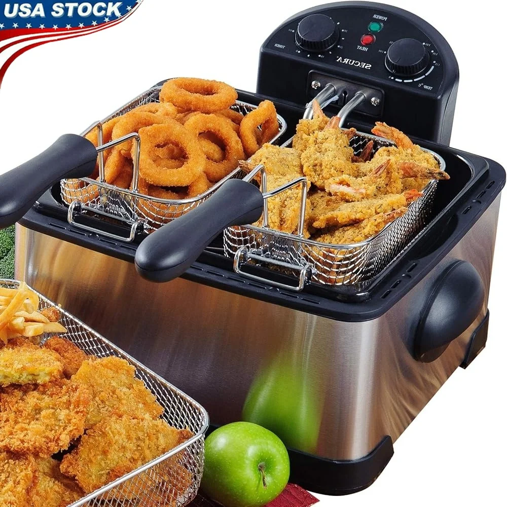 1700W Stainless Steel Electric Deep Fryer Triple Basket Timer Adjustable Heat Odor Filter 4L 17-Cup Fish Chicken Cooking