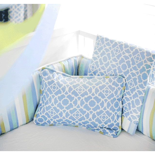 Clean & serene crib bedding exemplifies tranquility in any nursery! Our blue and green baby blanket makes a statement with stripes & fun lattice pattern. The blanket is made in Lattice in Ocean fabric with Ocean Spray Stripe flange reversing to...
