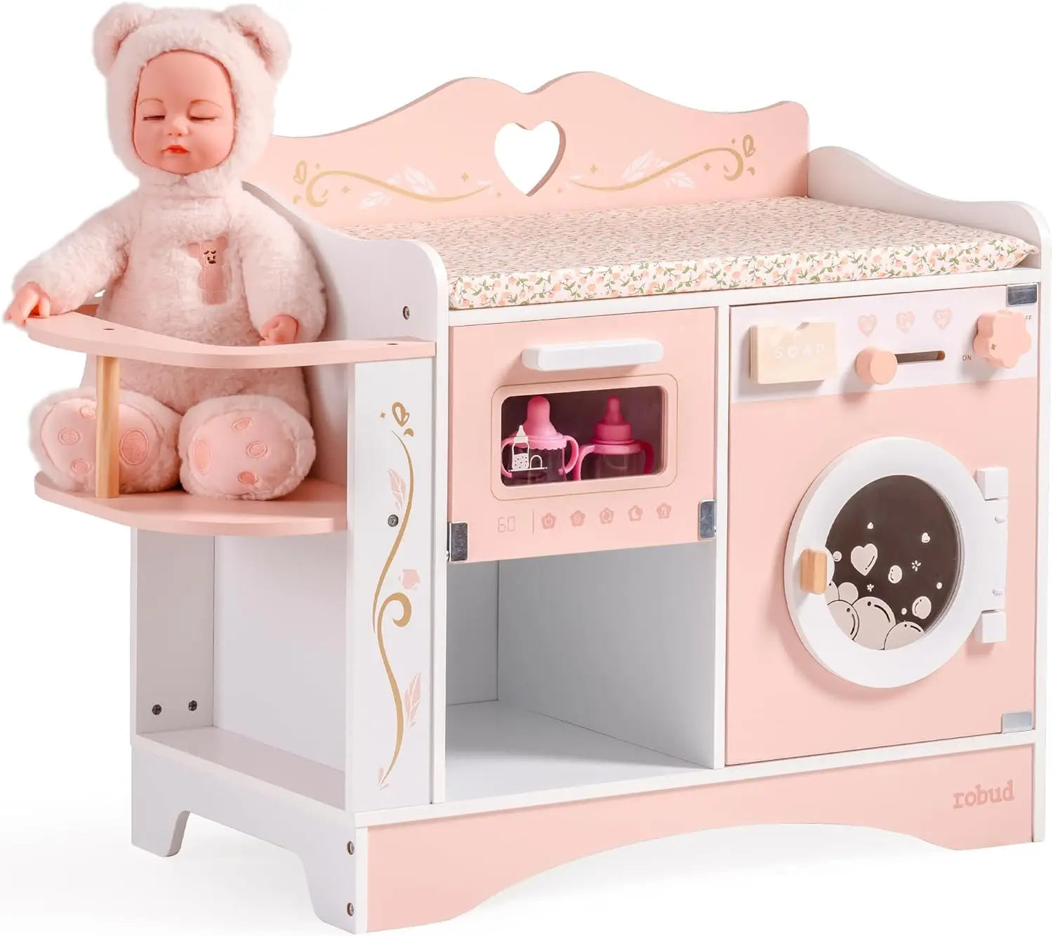 Robud Wooden 6-in-1 Baby Doll Changing Table with Baby Doll Crib Washing Machine Bottle Sterilizer Storage Area for Kids in Pink