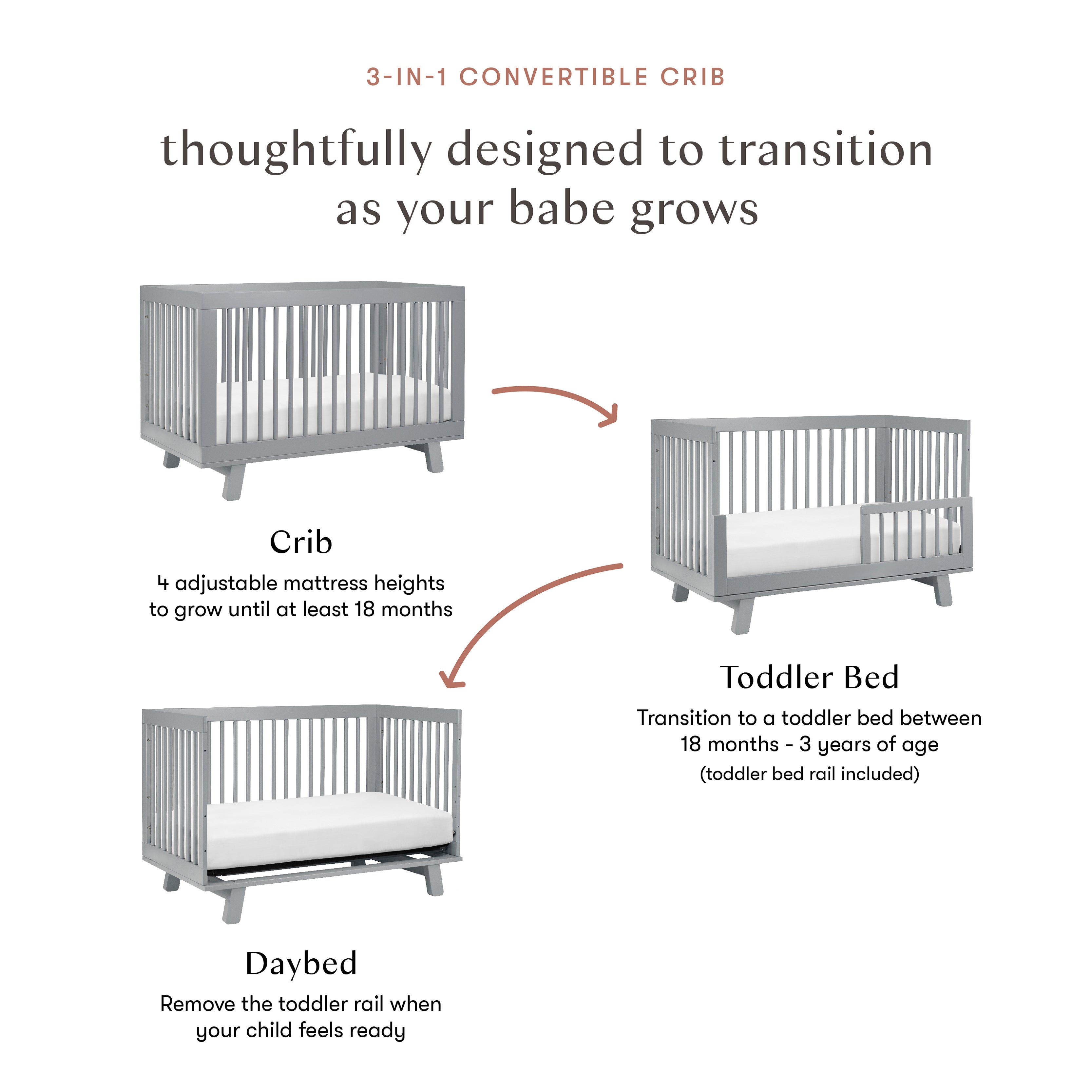 Babyletto Hudson 3-in-1 Convertible Crib with Toddler Bed Conversion Kit - Grey