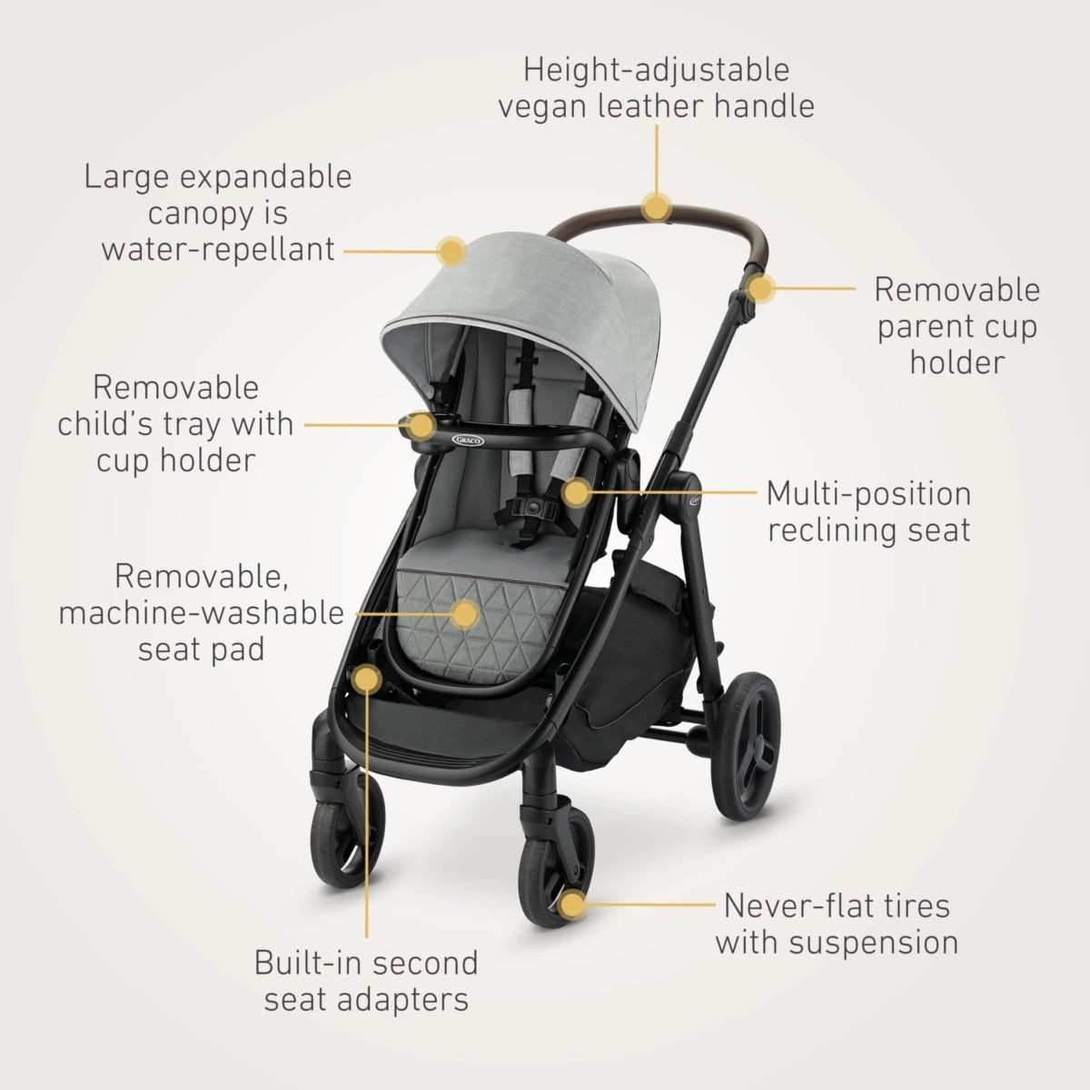 The Graco Premier Modes Nest2Grow 4-in-1 Stroller grows from a single to double stroller with the addition of an infant car seat, carry cot, or second seat (each sold separately), for 15+ ways to ride. As part of the Graco Premier Midtown...