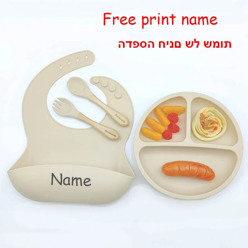 Silicone Feeding Plate Dishes For Kids Round Suction Cup Plate Baby Feeding Spoon Fork Wooden Handle Personalized Name Tableware
