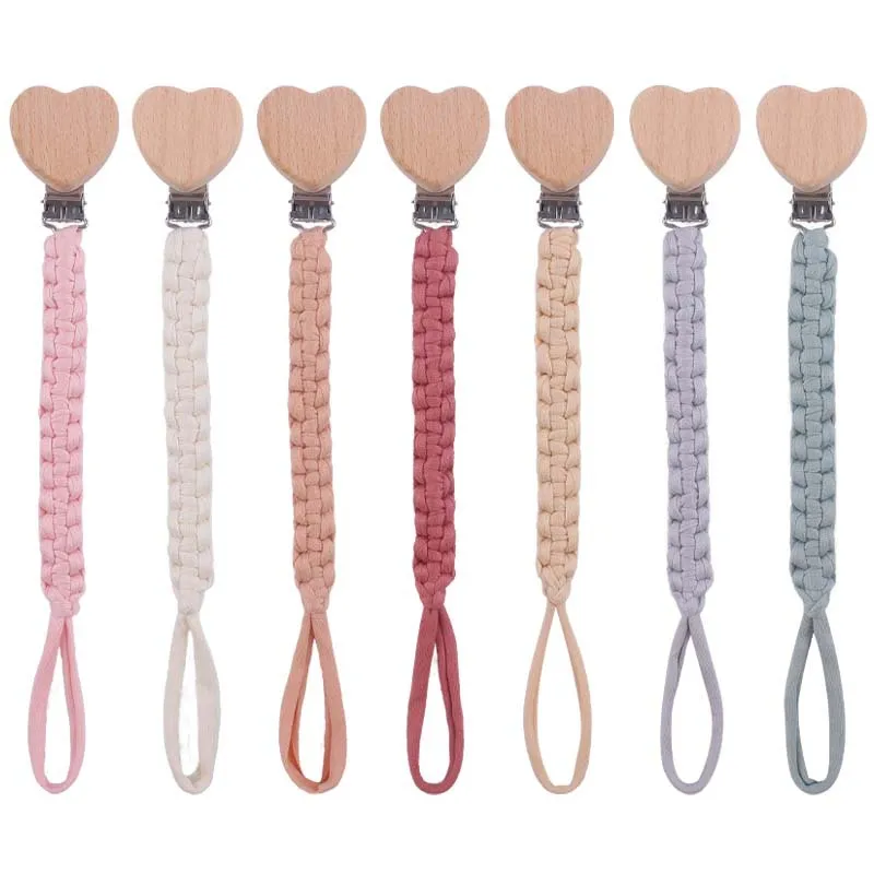 Baby Pacifier Chain Hand Braided Cotton Cloth Handmade Heart Shape Wooden Dummy Pacifier Clips For Nursing Teether Shower Gifts