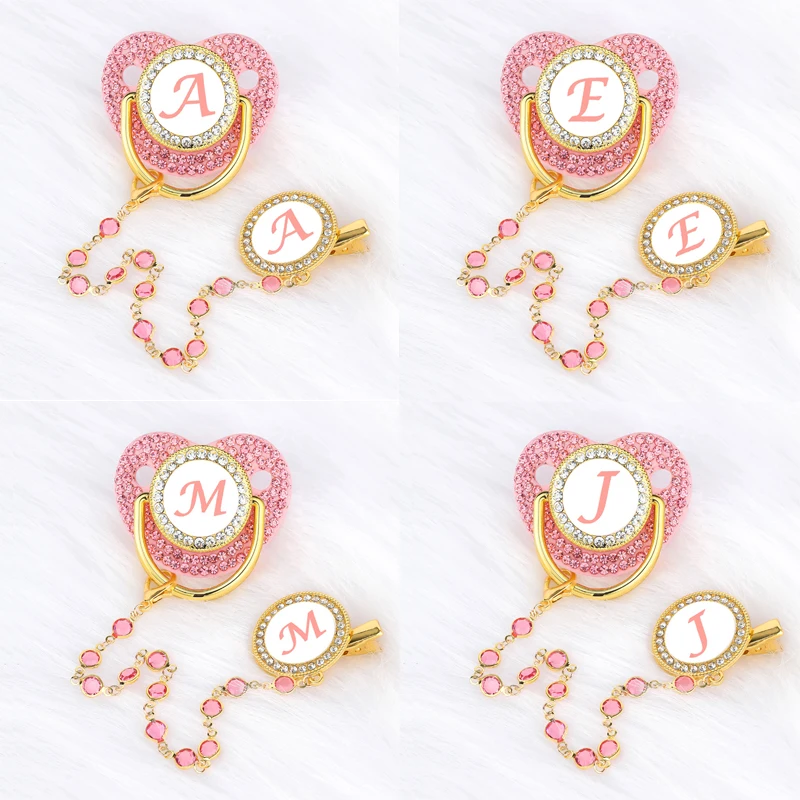 Name Initial Baby Pacifier Chain Clips Pink Crystal Newborn Luxury Personalized Pacifiers Silicone Nipple Infant Shower Gifts