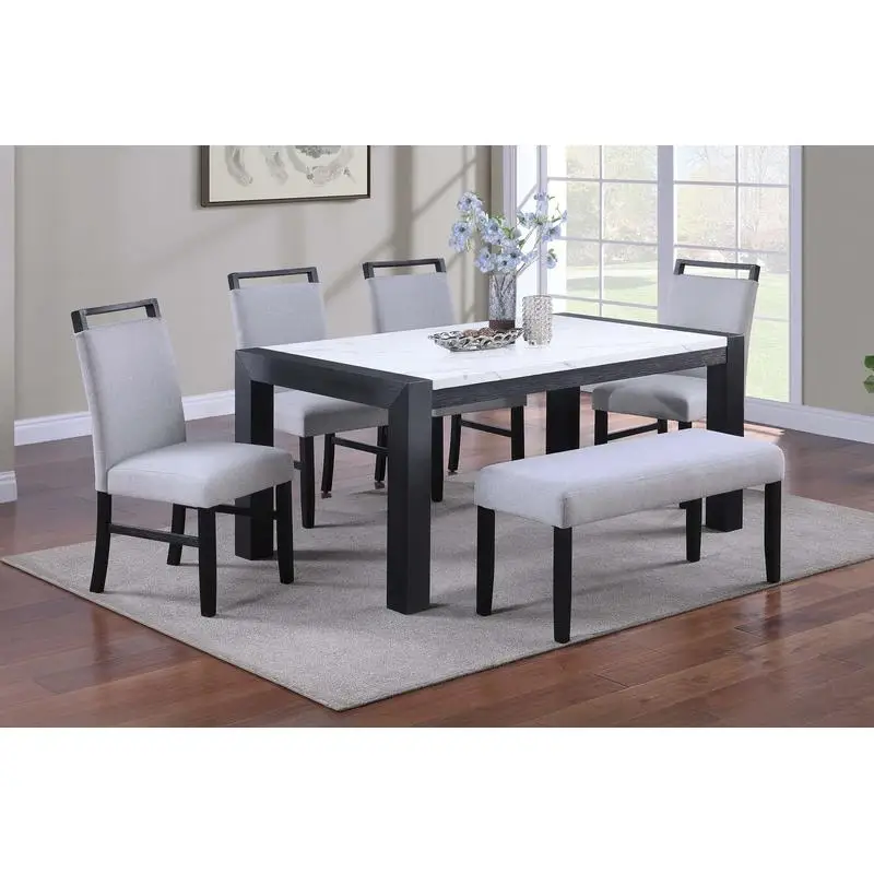 6-Piece Modern Dining Set: White Faux Marble Top Table, 4 Side Chairs & Bench, Wooden Design