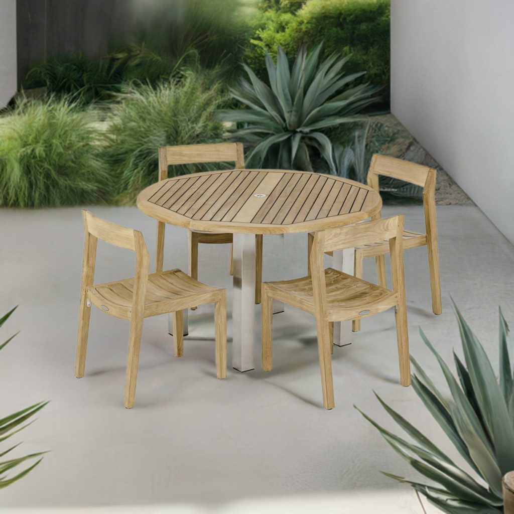 "Combines both traditional and contemporary elements. Includes 1 Vogue 4 FT Round table and 4 Horizon Side chairs. Crafted with SVLK Certified Grade A Teak harvested from sustainable plantations in Indonesia and premium stainless steel."  Read more