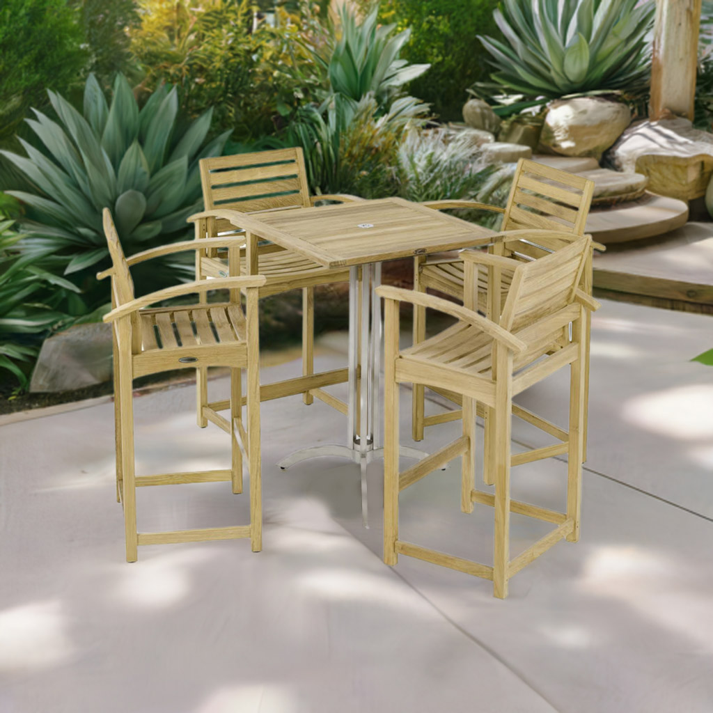 "5pc Premium Somerset Teak Wood Bar Table set built to last a lifetime. Includes 4 Bar Stools and 1 Square Vogue Teak and Stainless Steel Bar Table. Built to Commercial standards. Lifetime Teak Warranty. Quality Rated Best Overall by Wall Street...  Read more