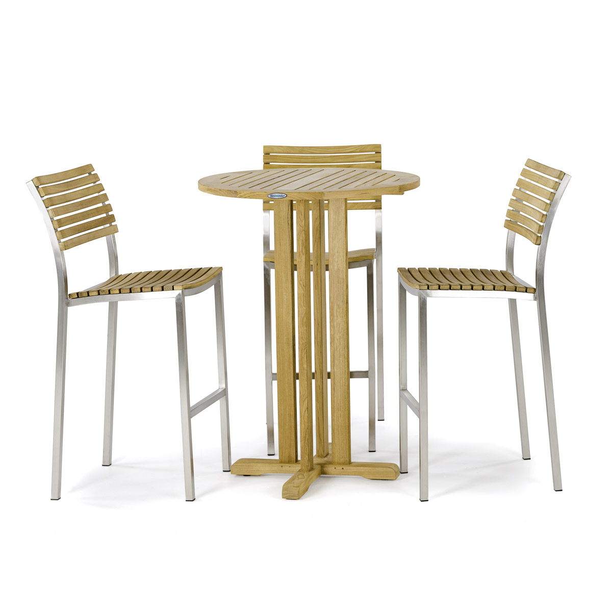 "3pc Premium Somerset Teak Wood Bar Table set built to last a lifetime. Includes 2 Somerset Bar Stools 1 Vogue Bar Table and 1 Gar Stainless Base. Built to Commercial standards. Lifetime Teak Warranty. Quality Rated Best Overall by Wall Street...  Read more