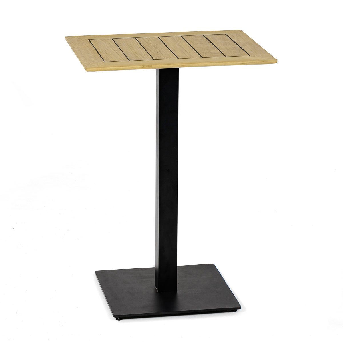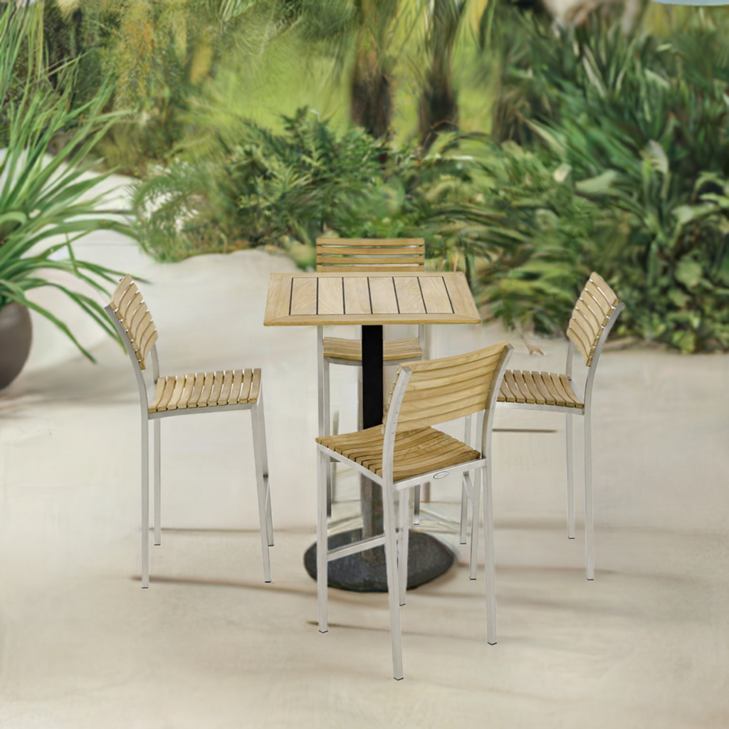 "24 inch Vogue Square Table combines stainless steel and teak wood into a sleek contemporary design. Accepts an optional umbrella."  Read more