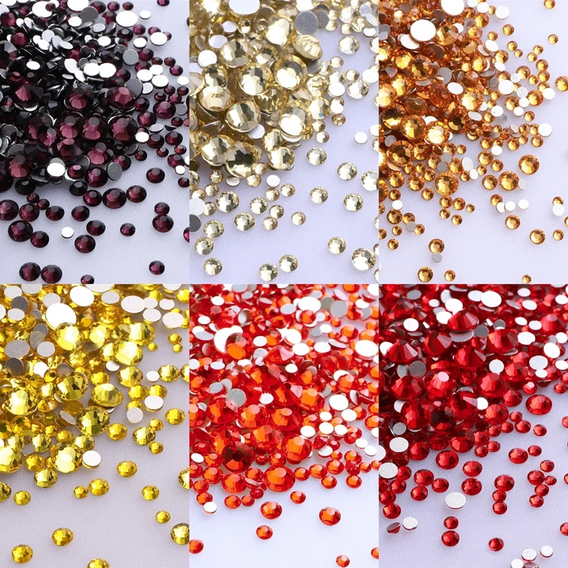 1440Pcs Mix Size Round Glass Flatback Rhinestone Glitter Yellow Glue On Stones Red Non Hot Fix Rhinestones for DIY Nail Art
