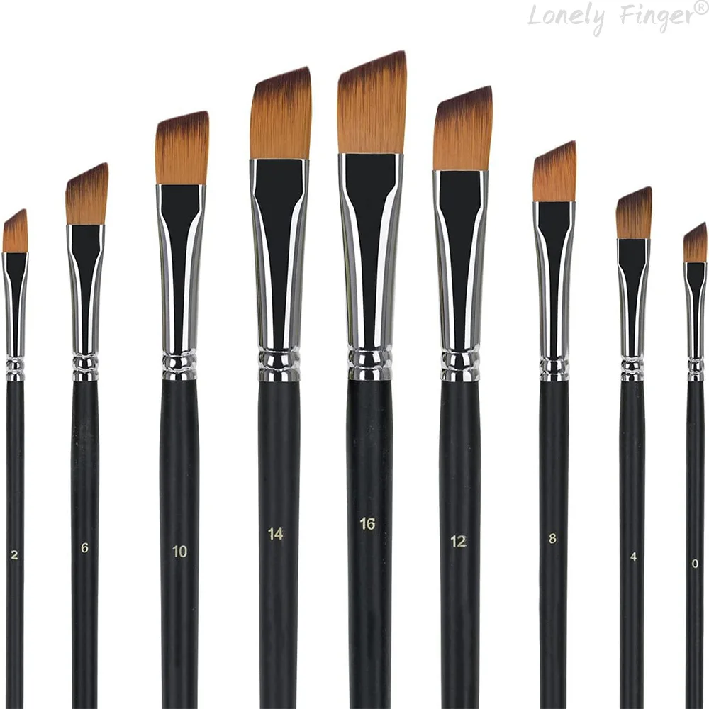 9pcs Oblique Tip Nylon Hair Long Handle Angled Paint Brushes Set Art Artist Professional Painting Supplies for Watercolor