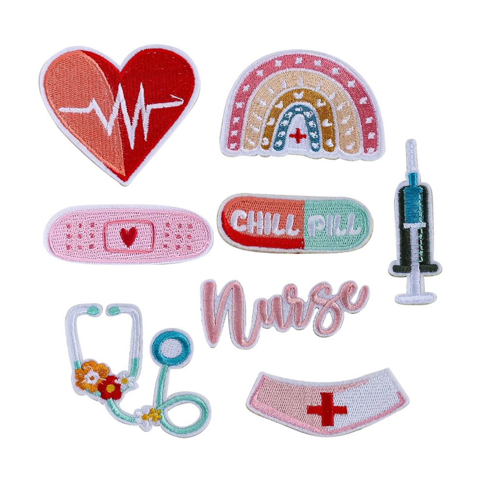 Fashion Embroidery Love Heart Syringe Stethoscope Shape Iron on Patch Nurses Day Hot Melt Glue Applique Clothing Sewing Supplies