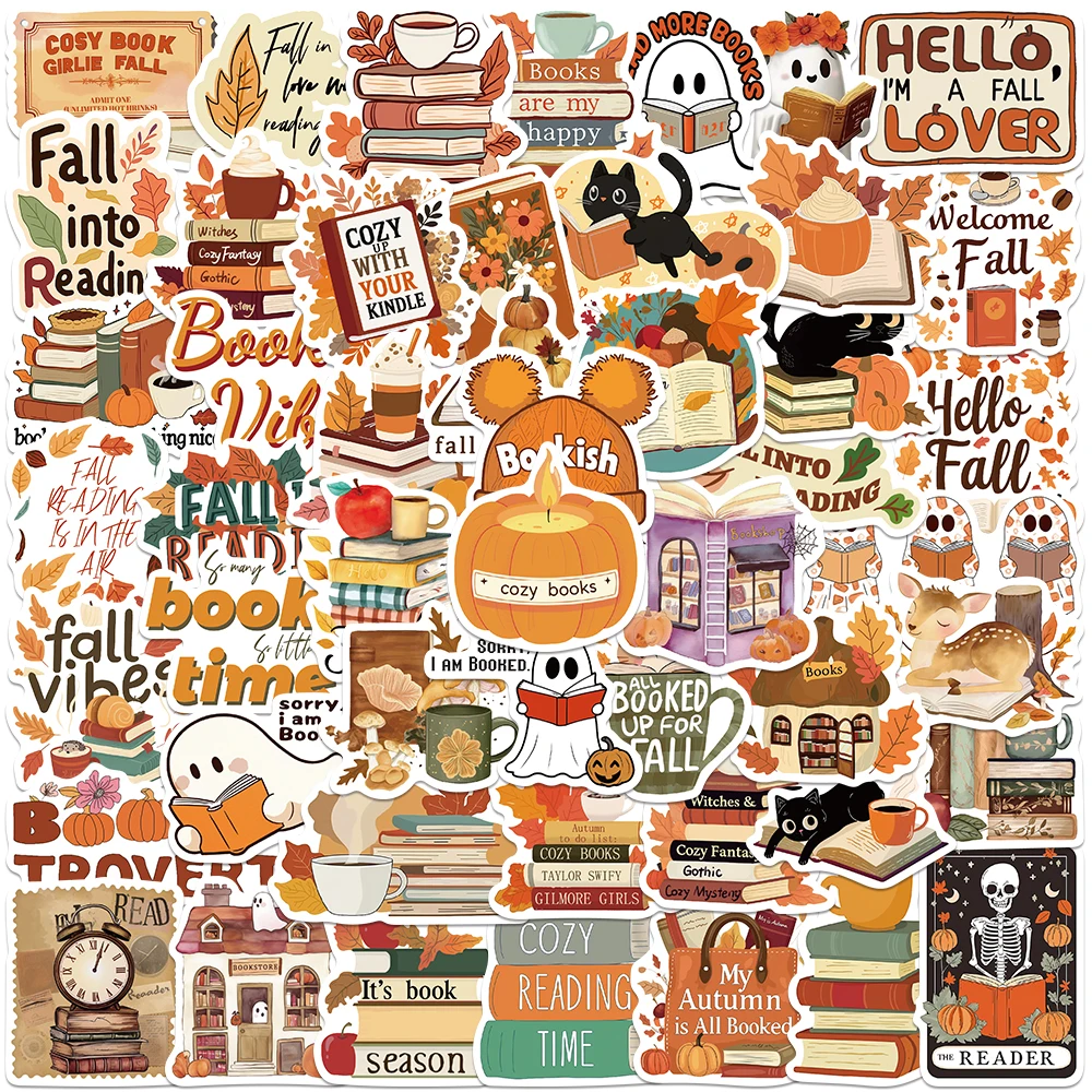50pcs Retro Cute Cartoon Autumn Reading Book Stickers Bookish Vinyl Decals Luggage Guitar Laptop Phone Waterproof Graffiti