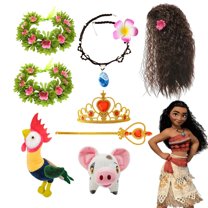 Gilrs Princess Moana Wig and Necklace Flower Clip Dress Up Set Halloween Vaiana Costume Accessories Moana Pet Pig and Cock Toys