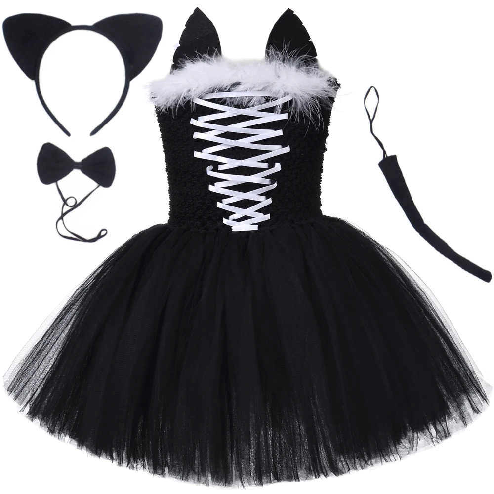 Black Cat Tutu Dress for Girls Carnival Halloween Costumes for Kids Toddler Animal Cosplay Outfit for Birthday Party Clothes Set