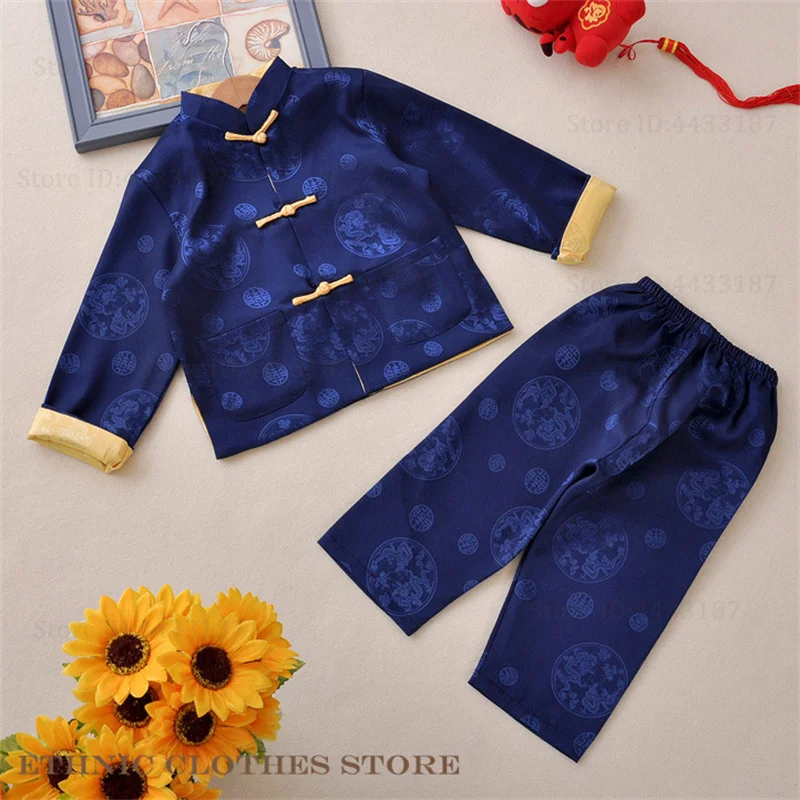 Kids Tang Suit Traditional Chinese Dragon New Year Costume Hanfu Retro Jacquard Oriental Clothing Spring New Long Sleeve Pants