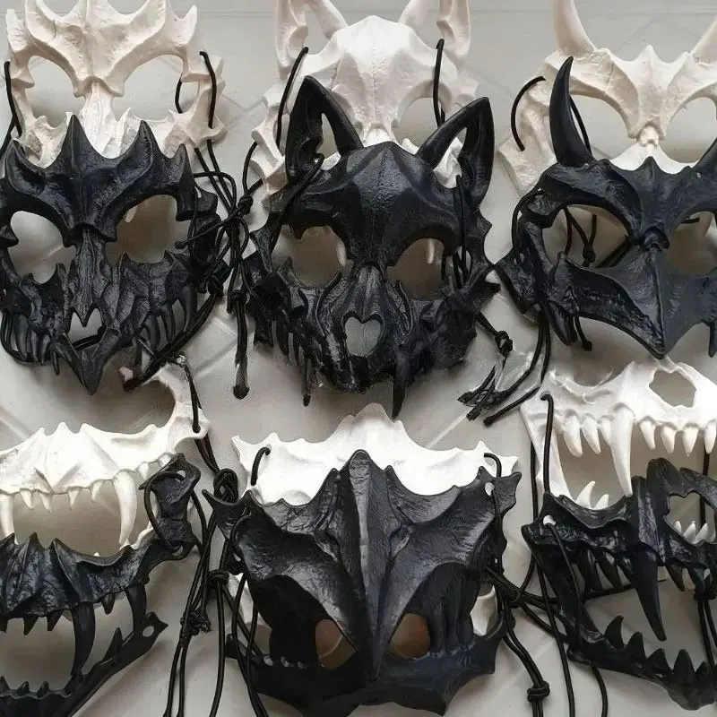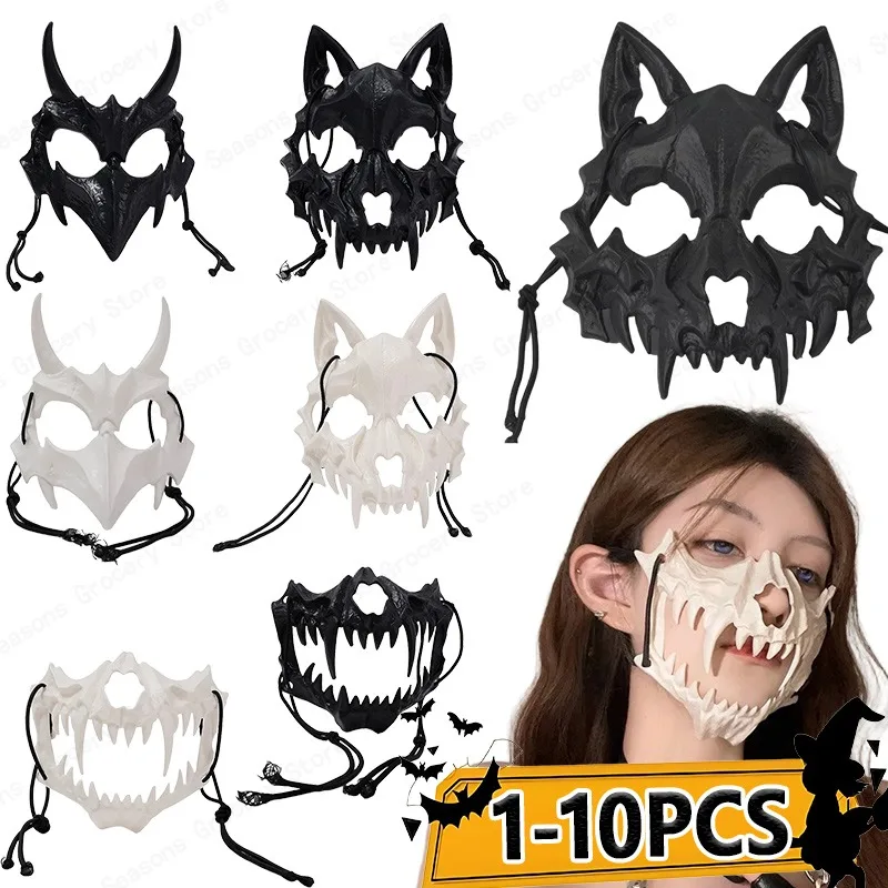 2025 Party Skull Mask Long Teeth Demon Skeleton Half Face Mask Wolf Dragon Tiger Houjuu Nue Mask Cosplay Halloween Costume Props