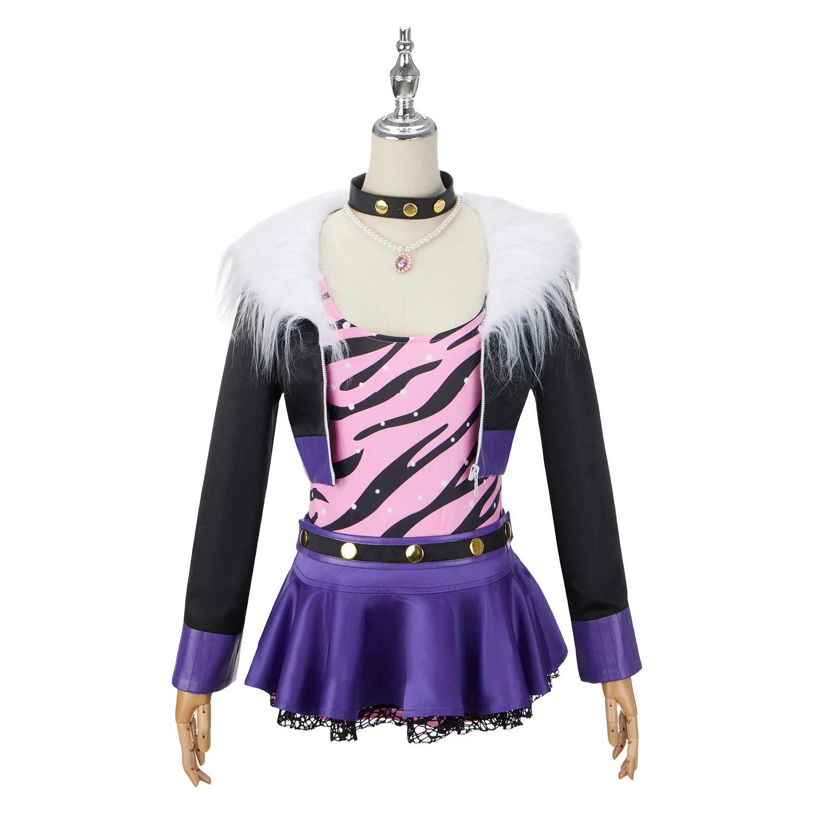 Anime Clawdeen Wolf Cosplay Costume Women Pink Top Fur Collar Coat Lace Skirt Set with Necklace for Halloween Party