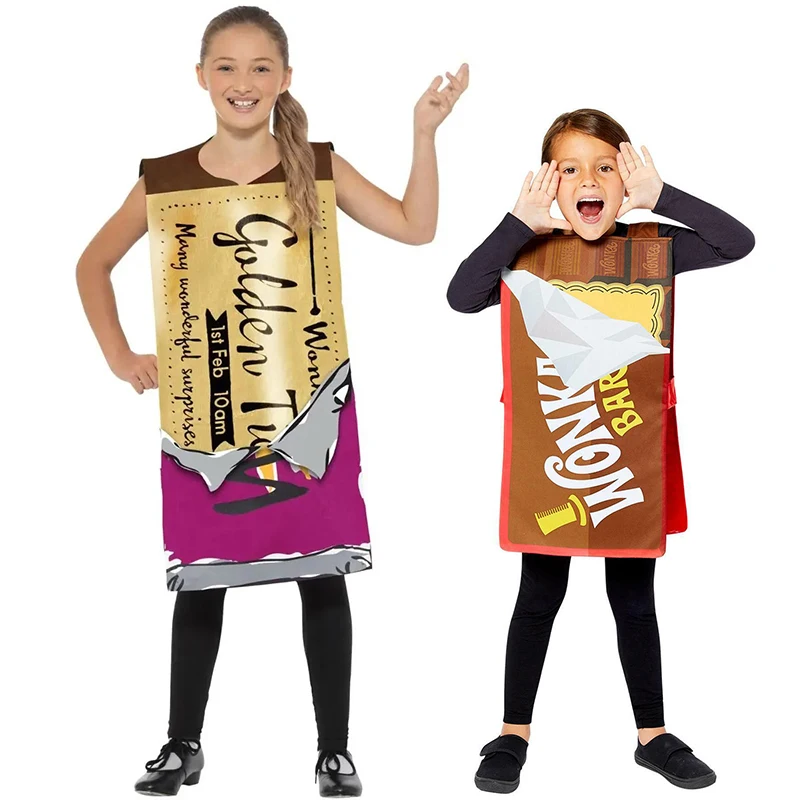 Unisex Boy Girl Chocolate Bar Winner Ticket Tunic Halloween Fancy Dress Up Chocolate Gold Coupon For Kids