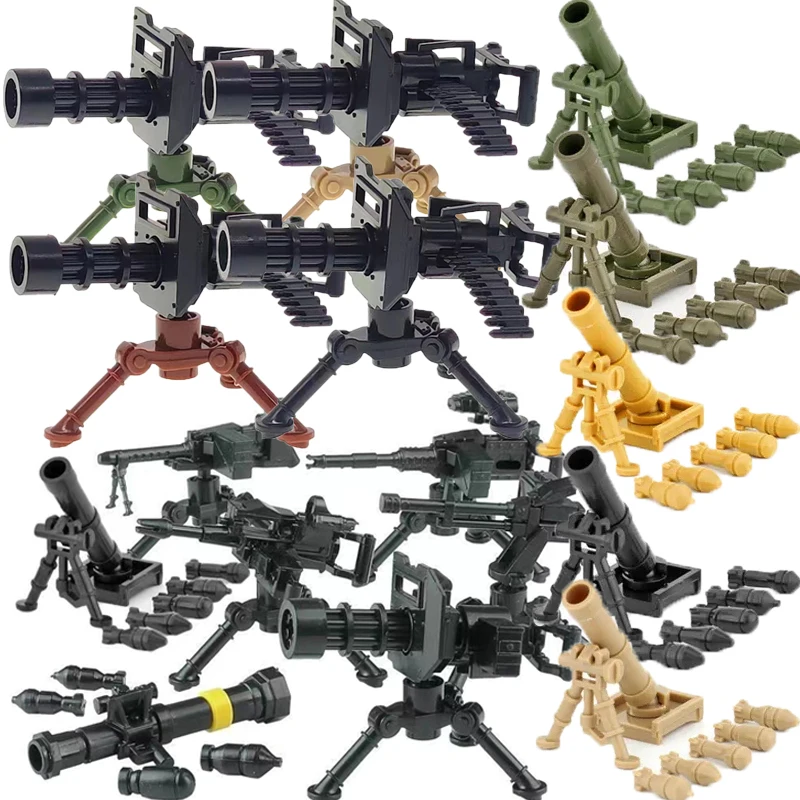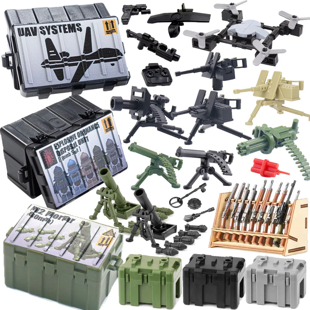 WW2 Military MOC Building Block Soldier Printed Weapon Case Rack Drone Bomb Disposal Mortar Gatling Maxine Gun DIY Toy Gift K046