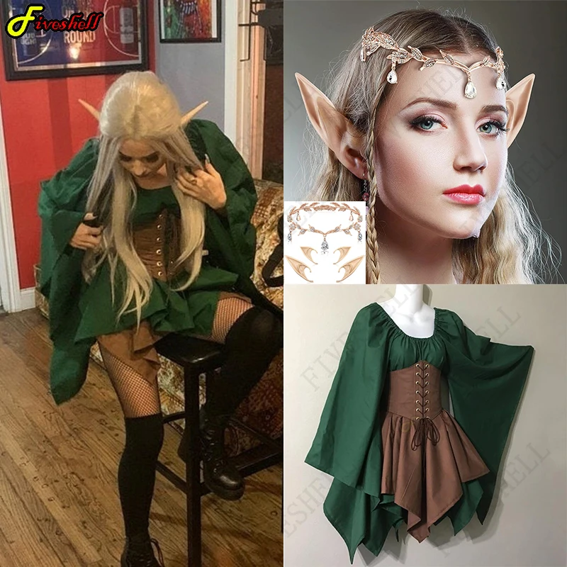 S-5XL Adult Women Medieval Elf Fairy Elven Costume Wench Celtic Princess Dress Lace Up Waist Cincher Corset Set Jagged Dresses  Read more