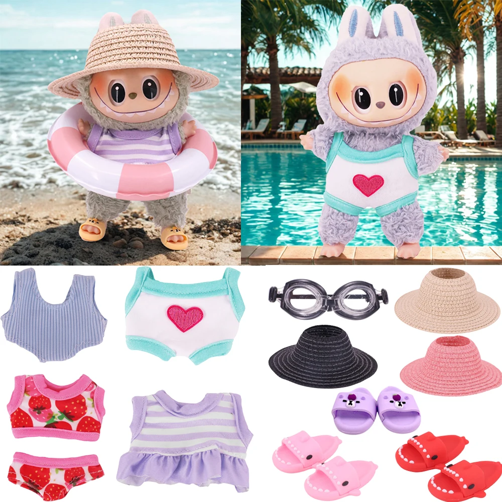 For Labubu Doll Clothes Swimsuit Cute Shark Slippers 15-17Cm Plush Doll Glasses Straw Hat, For labubu Accessories Holiday Gifts