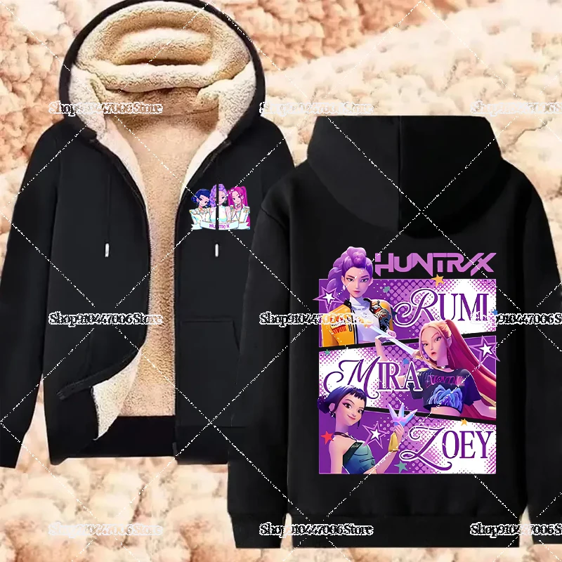 K Pop Demon Hunters Print Fleece-lined Zip-up Hoodies Huntrix Saja Boys Derpy Tiger Cardigan Adult Rumi Zoey Mira Winter Tops