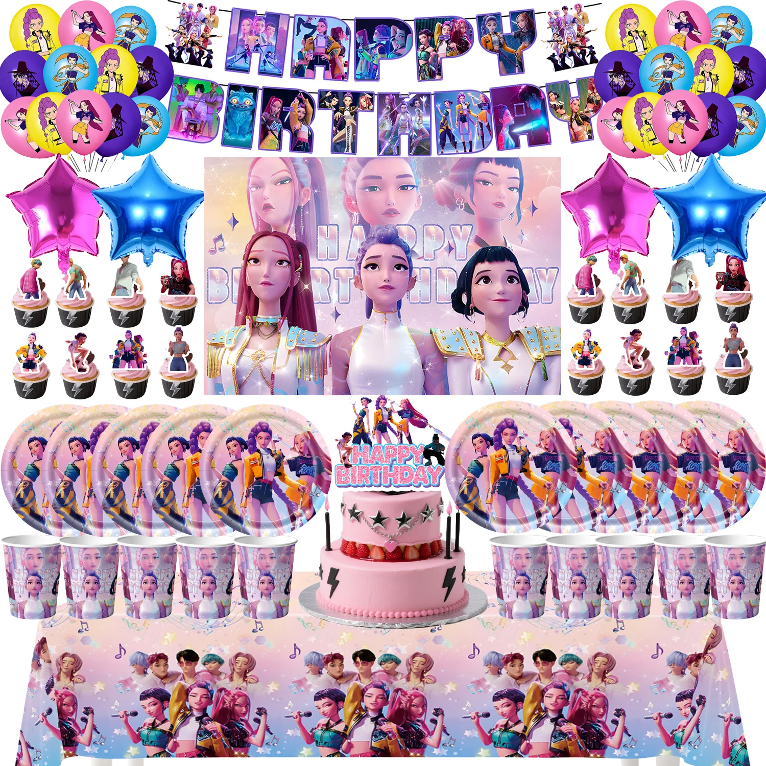 Kpop Demon Hunters Theme Disposable Tableware Korean Party Supplies Huntrix Saga Boys Cake Toppings Hanging Cloth Party Decorat  Read more