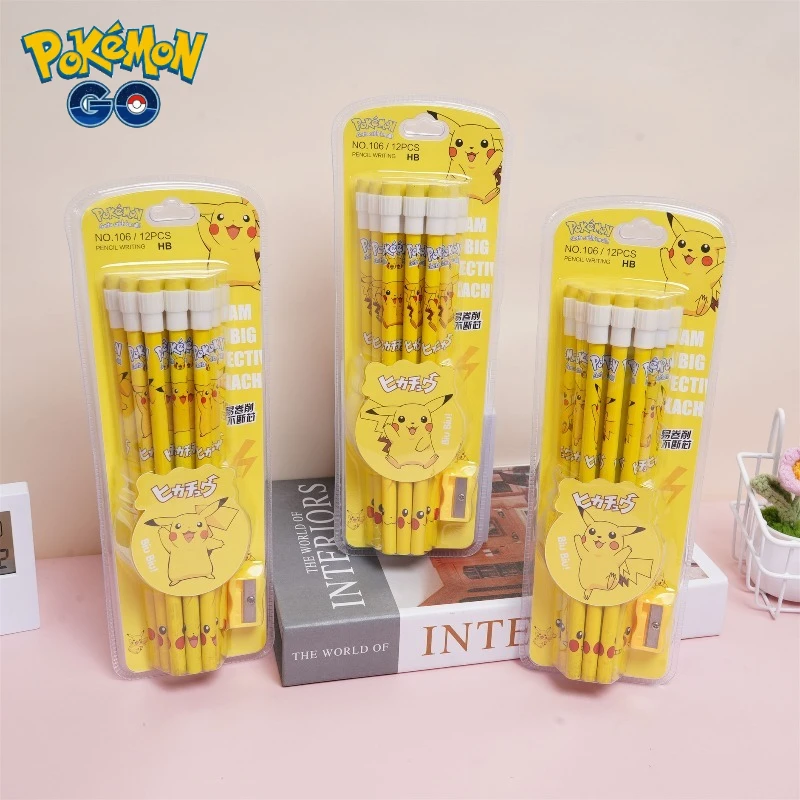 12pcs/box Pokemon Pencil Set with Eraser Pencil Sharpener Anime Figure School Supplies Office Stationery Tools Kawaii Gifts Toys