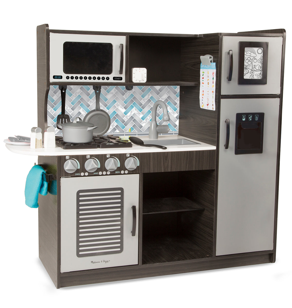 Budding young chefs can hone their craft in this beautifully designed, charcoal-colored modern play kitchen! The easy to assemble chef's kitchen includes a refrigerator/freezer with innovative working ice maker that dispenses two included "ice...