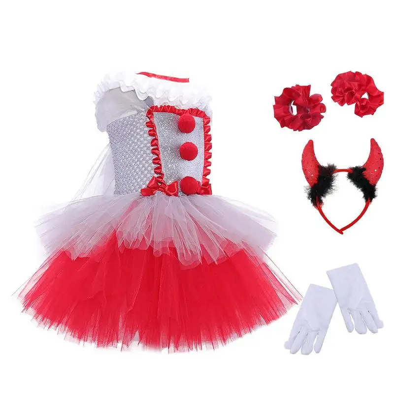 Halloween Scary Clown Cosplay Mesh Dress Set Girls Carnevil Clown Costume Creepy Circus Girl Romper Dress For Party Activities