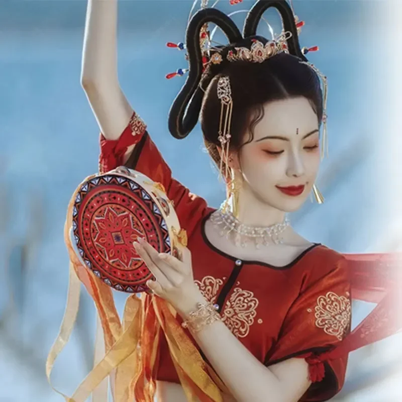 Chinese Hand Drum with Ribbon Bells Dunhuang Dance Stage Performance Decorative Tambourine Musical Instrument Photography Props